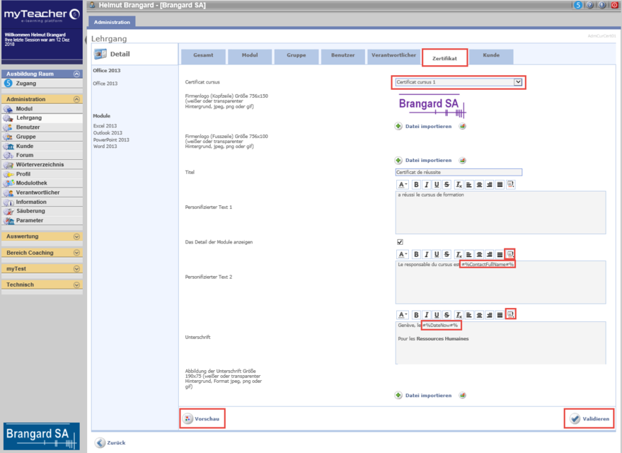 Passen Sie das Zertifikat an oder wählen Sie eine Zertifikatvorlage aus der Dropdown-Liste Zertifikat Lehrgang aus (sofern der Administrator sie im Bereich Administration> Parameter definiert hat).