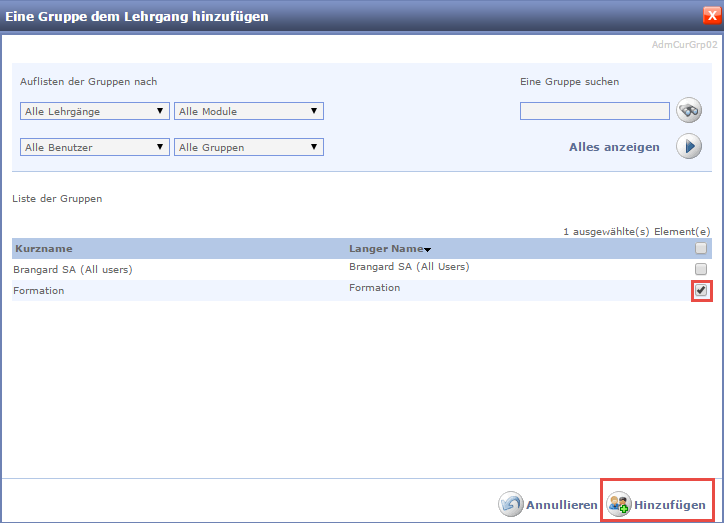 Das Fenster Eine Gruppe dem Lehrgang hinzufügen öffnet sich.