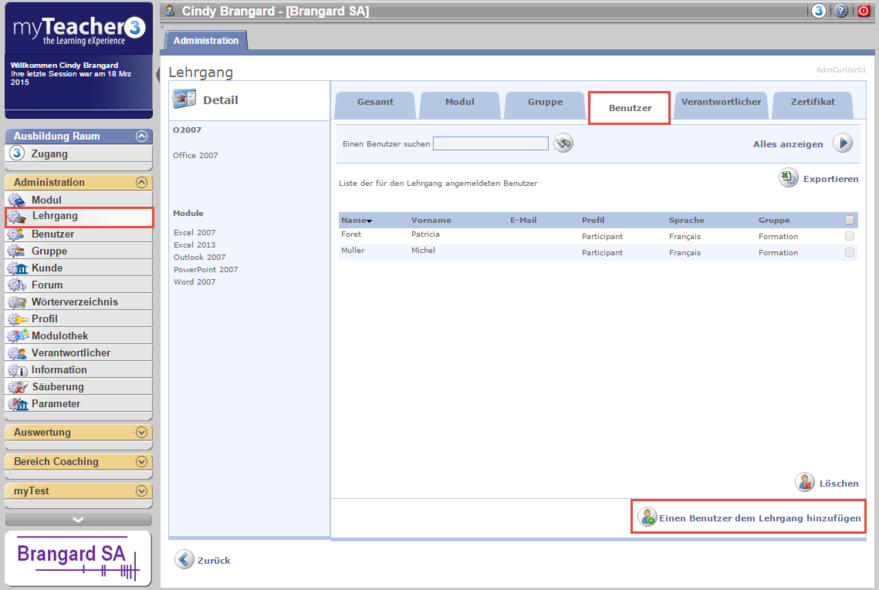 Die Schaltfläche Exportieren ermöglicht den Export der Liste der Benutzer die für diesen Lehrgang eingeschrieben sind ins Excel-Format und erlaubt damit das Drucken oder Speichern dieser Liste.