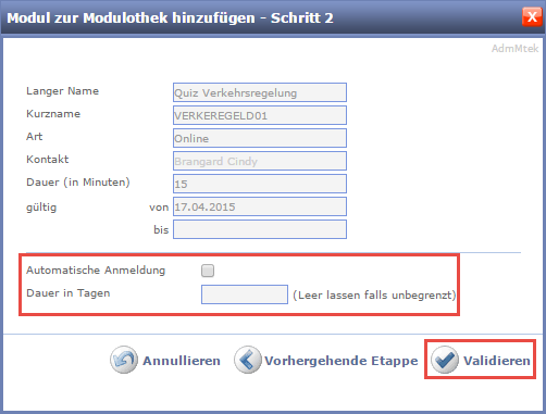 - Dauer in Tagen. In diesem Feld geben Sie die Anzahl Tage ein, die das (die) entsprechende(n) Modul(e) für den Benutzer in seiner Modulothek zur Auswahl bereit steht. Wenn Sie in diesem Feld keinen Wert eingeben, ist das (die) entsprechende(n) Modul(e) für den Benutzer unbegrenzt für die Auswahl / Anmeldung verfügbar.