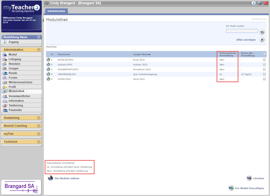 - Automatische Anmeldung. Wenn dieses Kontrollkästchen aktiviert ist, erscheint das (die) entsprechende(n) Modul(e) automatisch im Ausbildungsplan des Benutzers, sobald er in der Modulothek das (die) Modul(e) auswählt und sich dazu anmeldet.