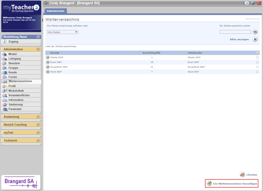 Im Bereich Administration können Sie unter der Rubrik Wörterverzeichnis neue Benutzer hinzufügen und verwalten. Bei jedem Import eines Moduls wird automatisch ein Wörterverzeichnis erstellt. Es handelt sich um importiertes Wörterverzeichnis. Sie können ausserdem neue Wörterbücher erstellen und verwalten, die dann mit einem oder mehreren Modulen verknüpft werden können. Sie können dem Wörterverzeichnis auch dann Begriffe hinzufügen, wenn dieses importiert wurde. Diese Einträge bleiben auch nach einem erneuten Import des Moduls erhalten.