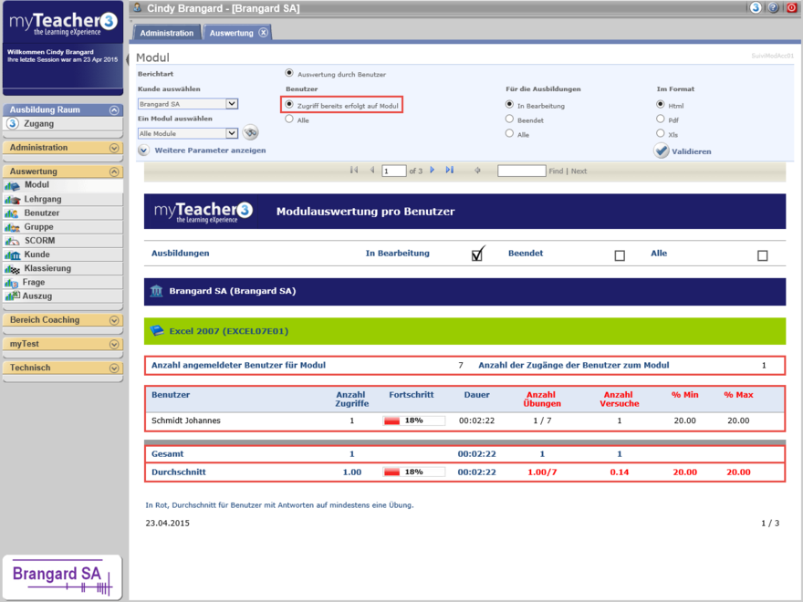 Ebenfalls sind beim Durchschnittswert für die Dauer der Bearbeitung alle Einzelwerte enthalten, egal ob ein Benutzer einmal oder mehrere Male das Modul bearbeit hat.