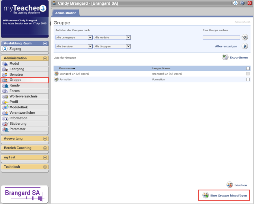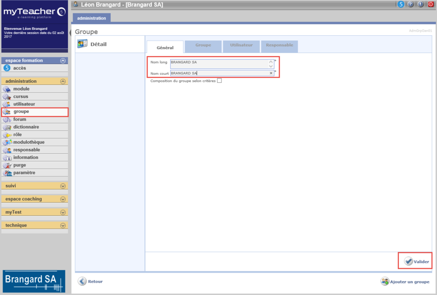 Schließlich klicken Sie auf Validieren, um die eingegebenen Daten zu speichern und somit eine Gruppe und/oder Benutzer und/oder Verantwortlicher dieser Gruppe hinzuzufügen.
