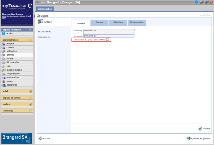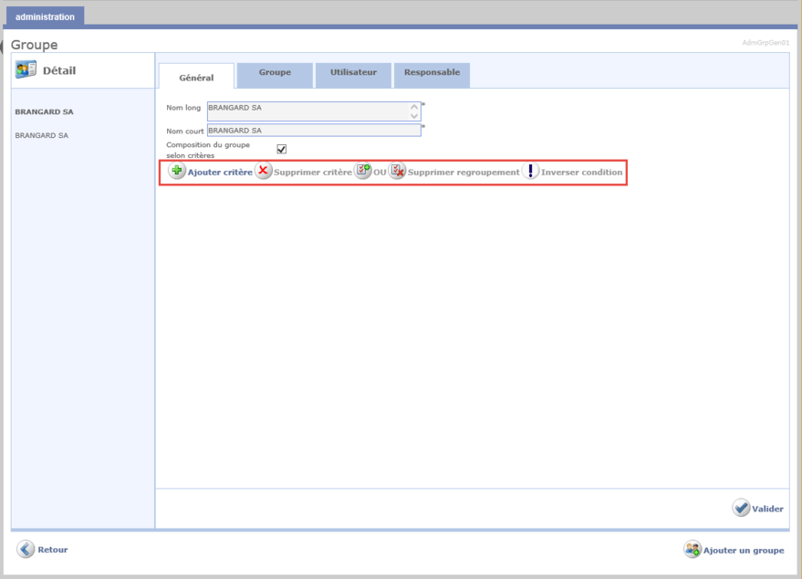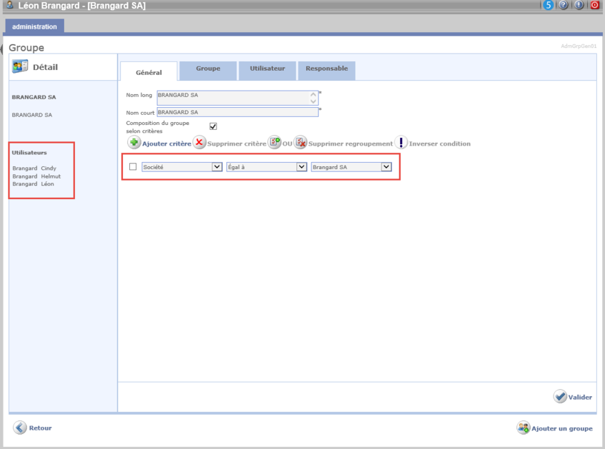 Validieren, um die Kriterien der Gruppe zu speichern. Die Liste der Benutzer die diesen Kriterien entspricht, erscheint im linken Band der Gruppe.