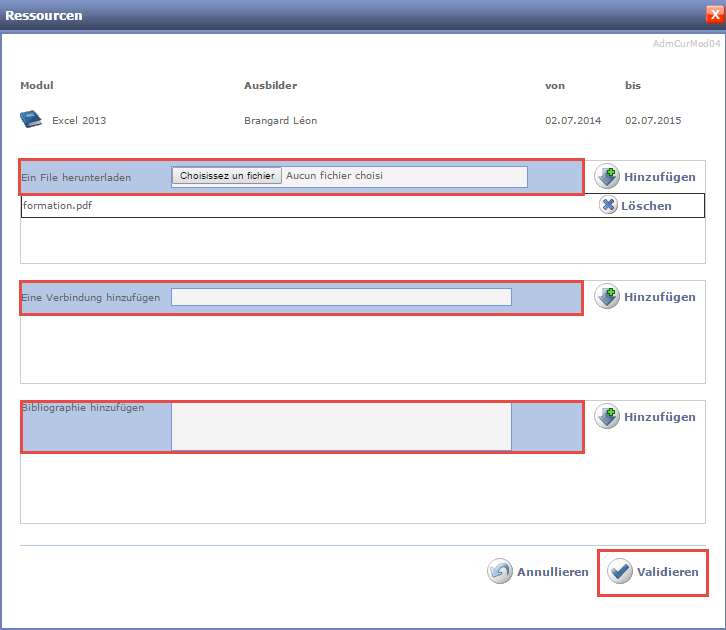 Wenn Sie beispielsweise eine Datei herunterladen möchten, durchsuchen Sie die Festplatte nach dieser Datei. Klicken Sie dann auf Hinzufügen und anschliessend auf Validieren, um diese Ressource zu speichern.