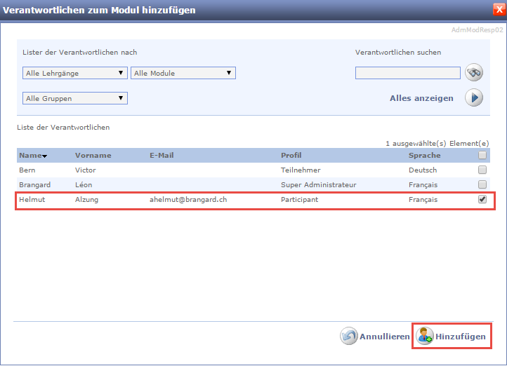 Ein Verantwortlicher überwacht die Lehrgänge, die Module, die Gruppen oder Benutzer, für welche er zuständig ist.