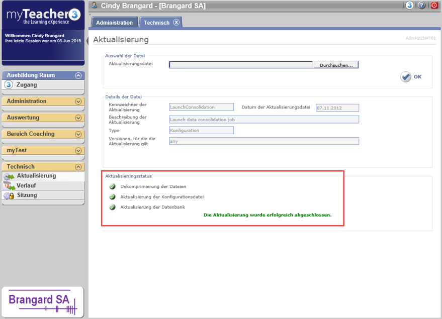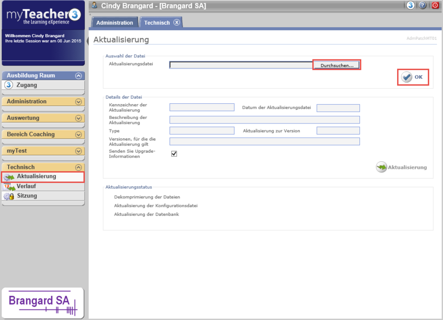 Die Rubrik Aktualisierung des Blocks Technisch erlaubt, die Version der Plattform myTeacher zu aktualisieren.