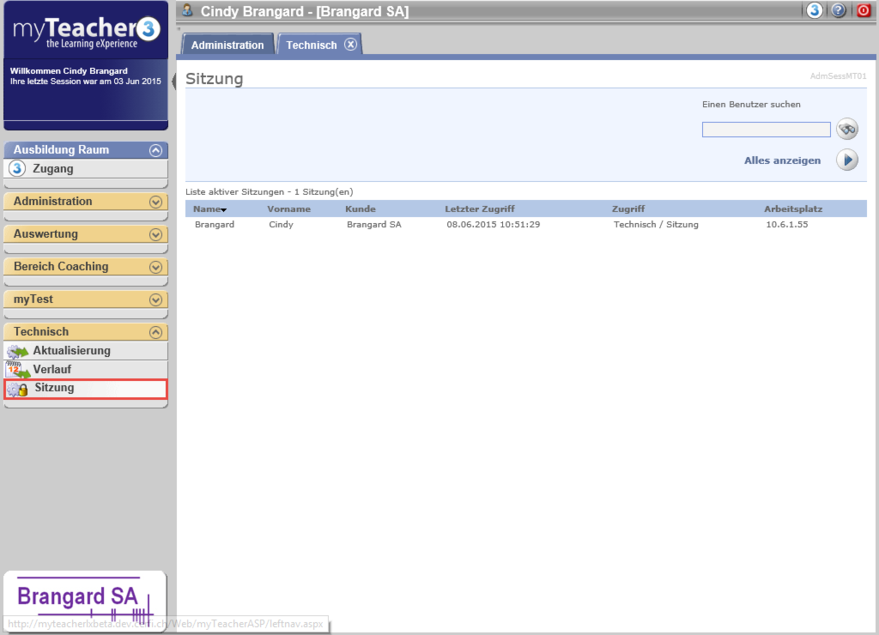 Die Rubrik Session des Blocks Technisch erlaubt die Liste der aktiven Sessionen (angeschlossene Benutzer) der Plattform myTeacher anzuschauen.
