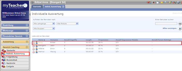 In der Registerkarte Individuelle Auswertung sieht der Verantwortliche die Benutzerliste, für die das Coaching sichergestellt wird.
