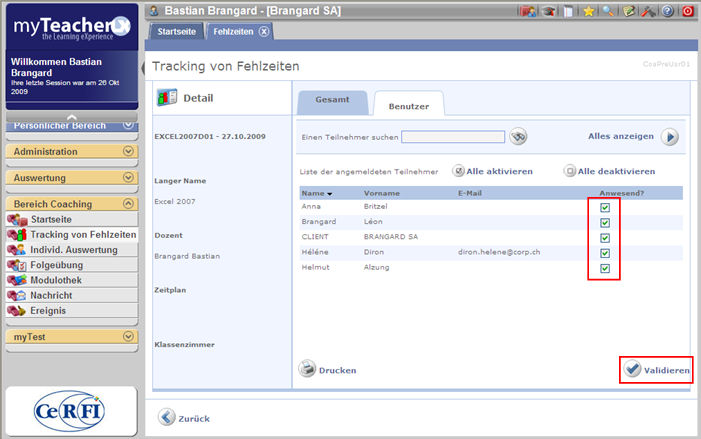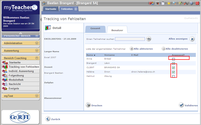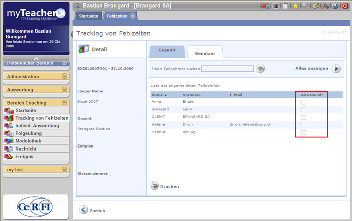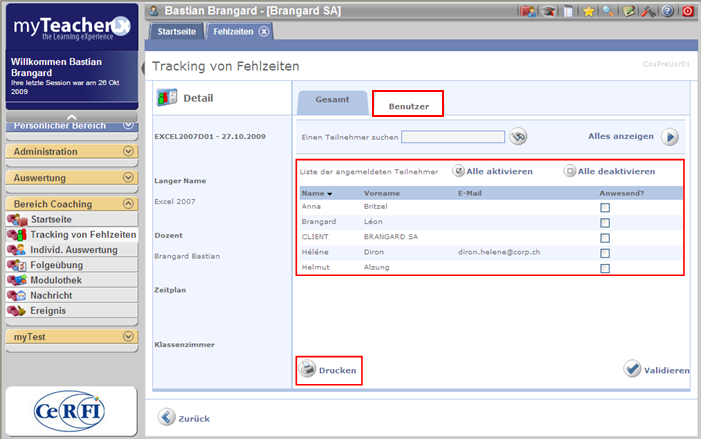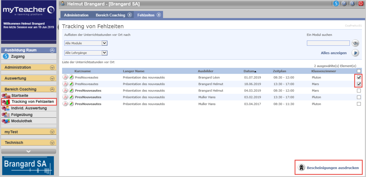 Auf dem Abwesenheitsbildschirm kann der Trainer oder die Person, die das Recht hat, hat Abwesenheiten verfolgt die Zertifikate der Klassenzimmerkurse ausdrucken.