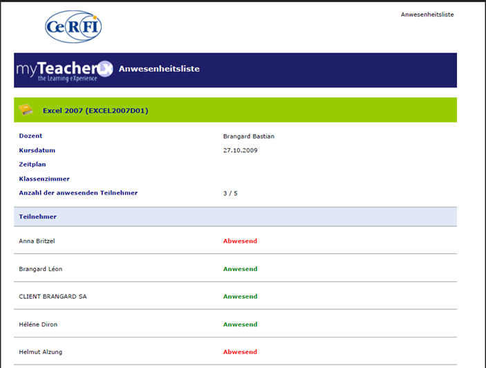 - Ein Klick auf das pdf-Symbol generiert die Anwesenheitsliste für diesen Kurs.