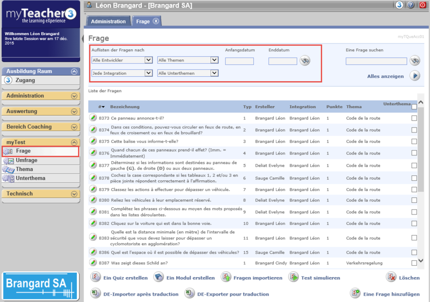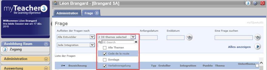 Quiz verwalten: Hier können alle Fragen, die auf der Plattform myTeacher vorhanden sind, verwaltet werden