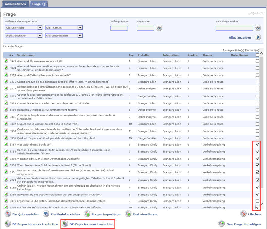 Wählen Sie die gewünschten Fragen und klicken Sie auf Für Übersetzung exportieren.