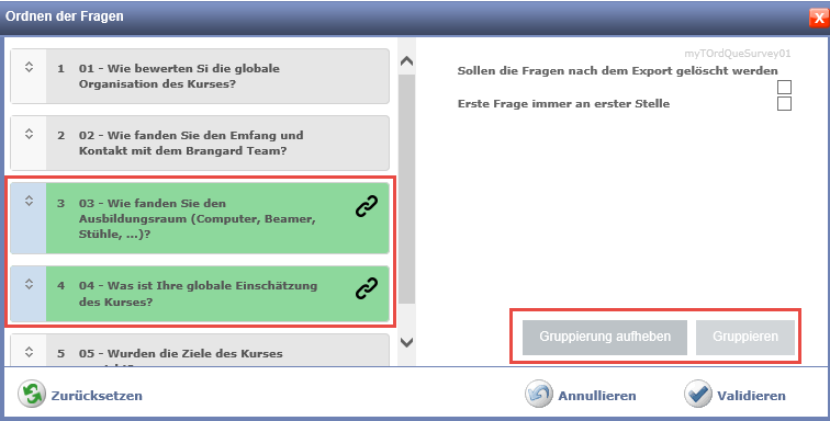 Es ist auch möglich zu definieren, dass die erste Frage dieser Liste immer an erster Stelle erscheint (standardmäßig werden die Fragen gemischt). Das Kontrollkästchen Erste Frage immer an erster Stelle abhacken.