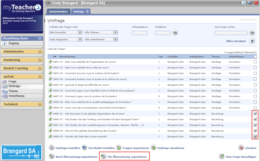 Wählen Sie die gewünschten Fragen und klicken Sie auf Für Übersetzung exportieren.