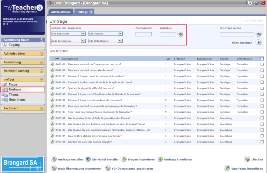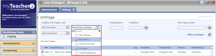 Die Rubrik Umfrage im Block myTest erlaubt Fragen zu Erstellen und zu ändern um eine Umfrage zu generieren wonach ein Thema durch den Benutzer evaluiert werden kann.