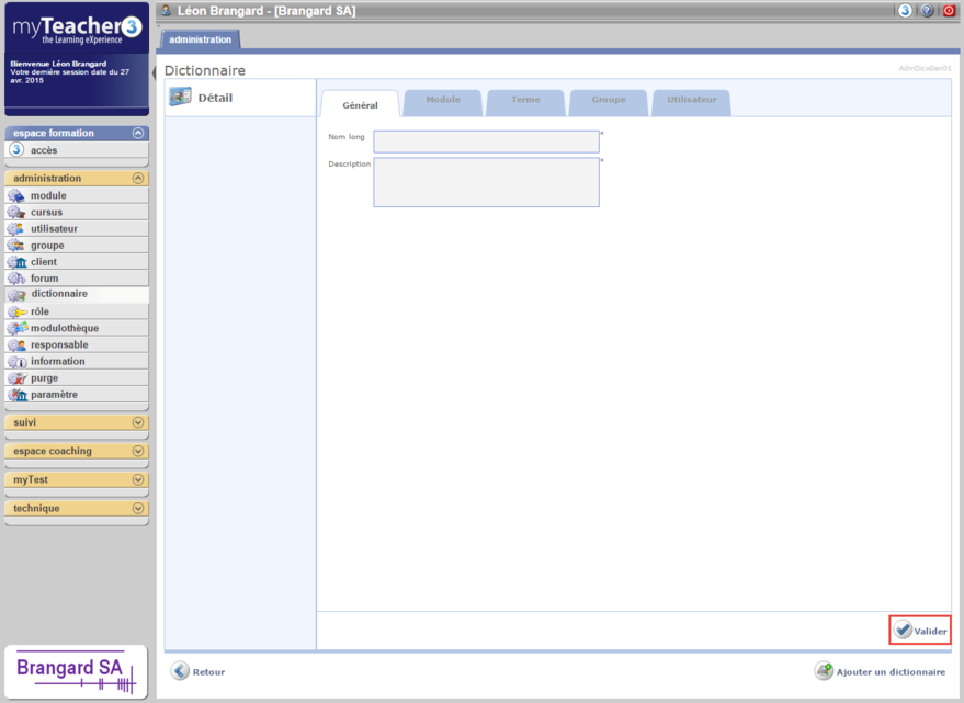 L'onglet Général permet de saisir le nom long du dictionnaire ainsi qu'une description. Ces deux champs sont obligatoires.
