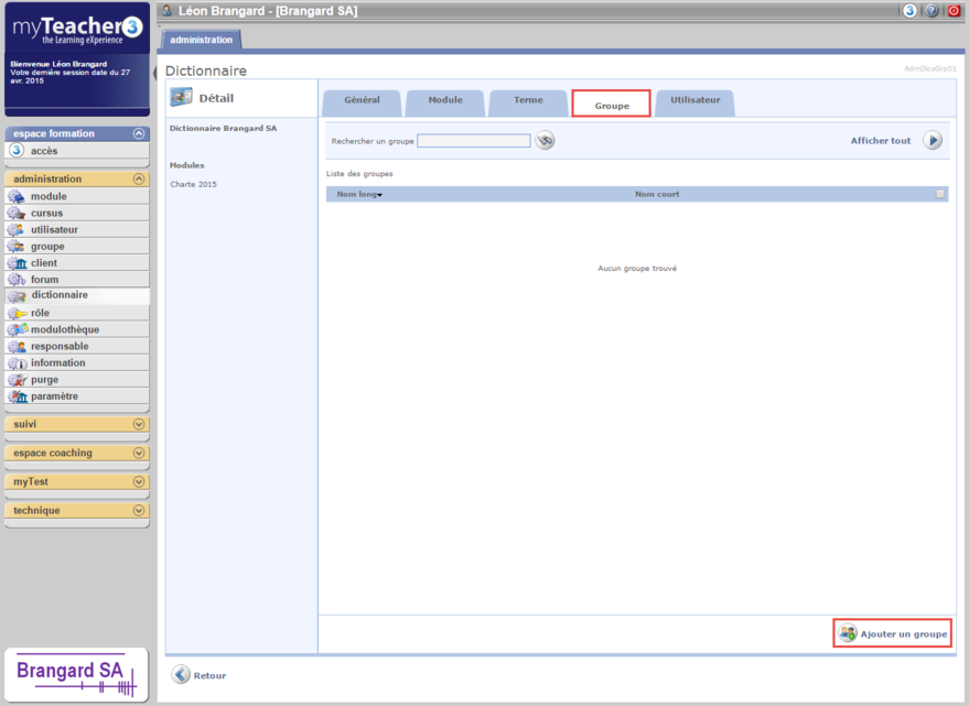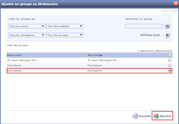 Sélectionner le dictionnaire auquel vous souhaitez inscrire un groupe.