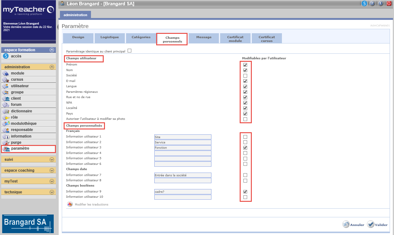 L’administrateur myTeacher détermine ici si l’utilisateur peut modifier lui-même ses champs standards ou non.