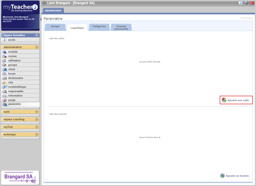 Lors de la création d'un module en salle, il convient de spécifier l'horaire et la salle où se tiendra le cours. La sélection s’effectue grâce à des listes déroulantes.