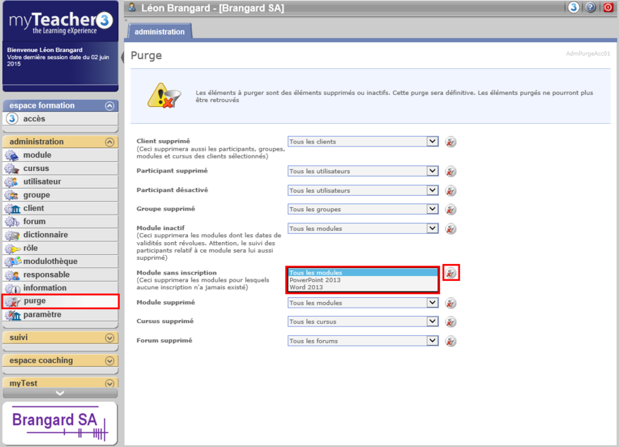 Cette fonctionnalité est accessible avec le droit Purger la plate-forme.