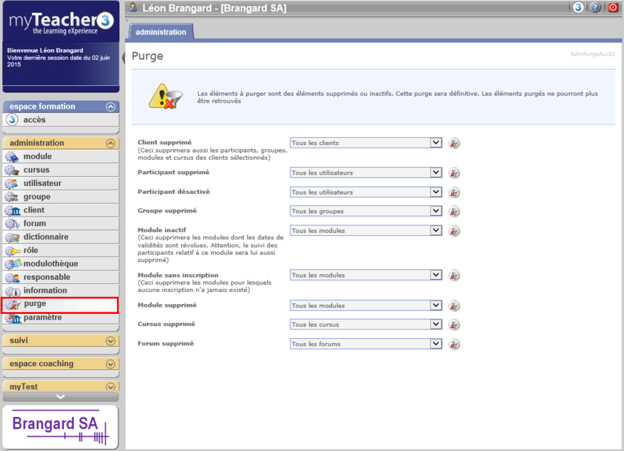 La rubrique purge du bloc administration permet de supprimer définitivement ces informations du serveur afin de libérer de l'espace disque.