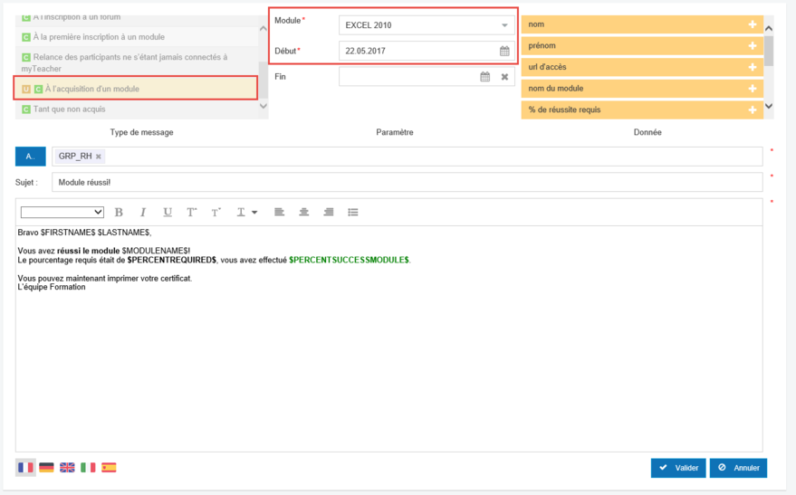 Pendant la période comprise entre les dates Début et Fin, ce message partira vers les utilisateurs et/ou groupes spécifiés (dans la zone A) dès qu'ils auront réussi le module spécifié dans la zone Module.