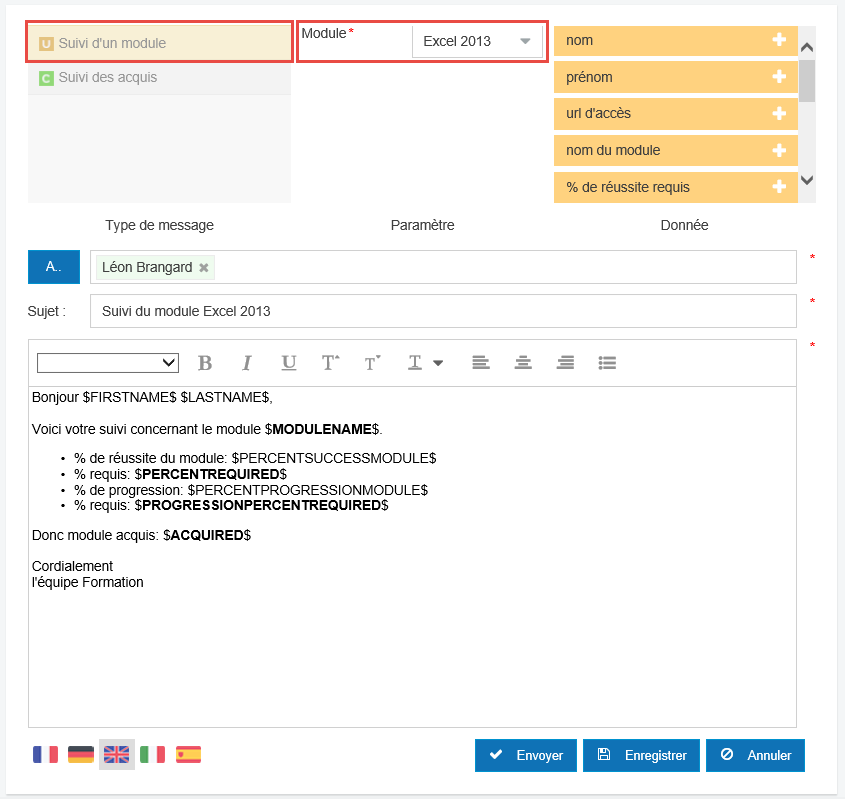 Dans la catégorie instantané, créer un message de type Suivi d'un module.