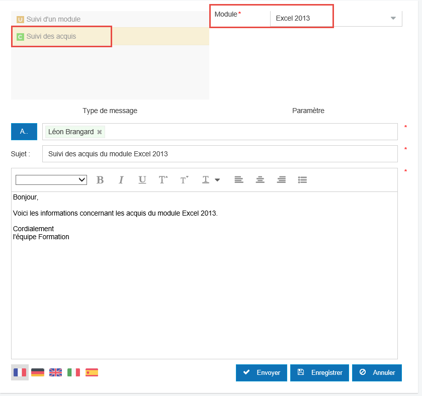 Dans la catégorie instantané, créer un message de type Suivi des acquis.