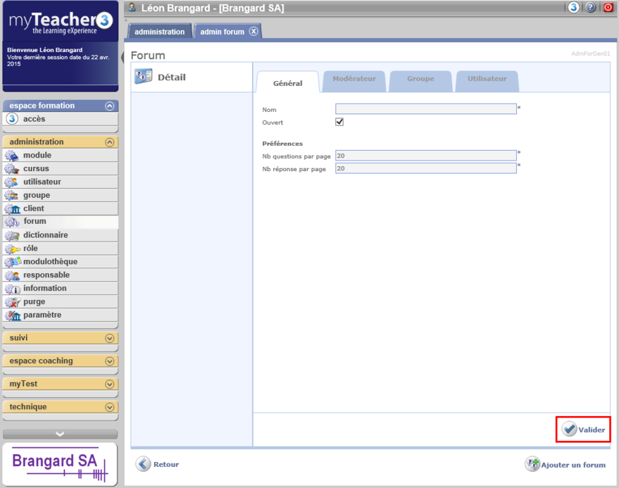 Cliquer sur le bouton Valider pour enregistrer les données saisies et avoir la possibilité d'attribuer un modérateur au forum, et d'inscrire des groupes et/ou utilisateurs au forum.