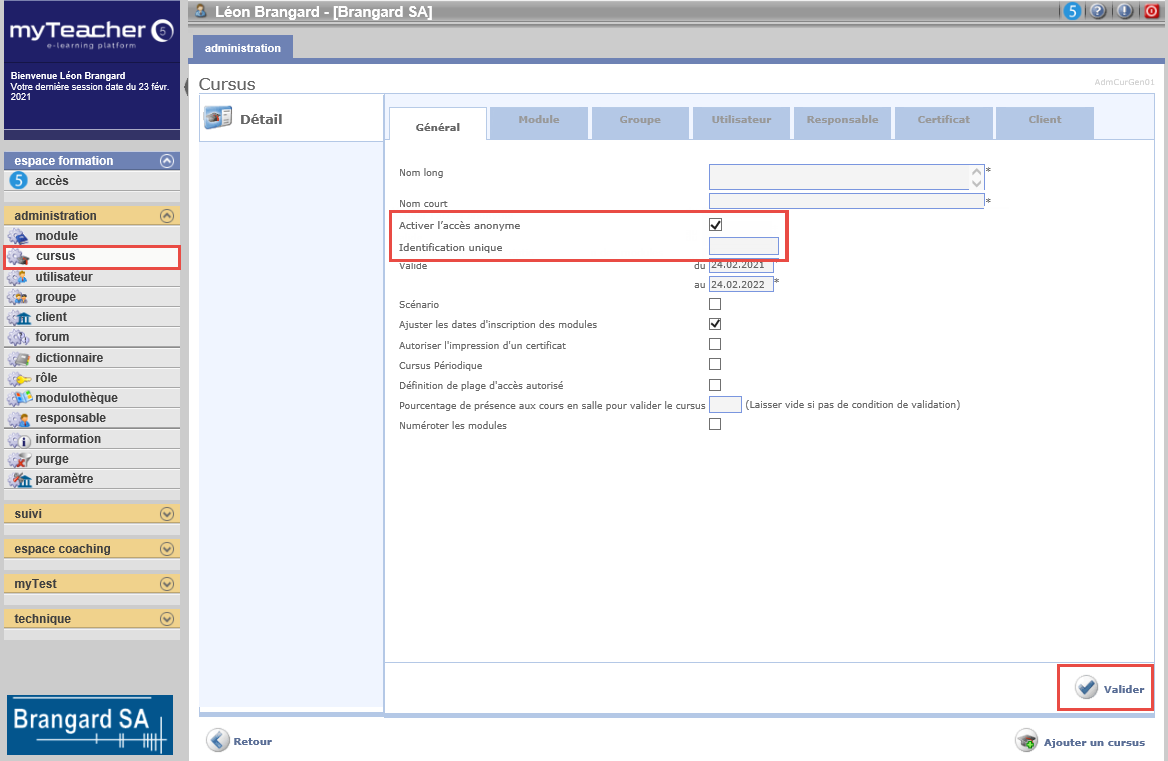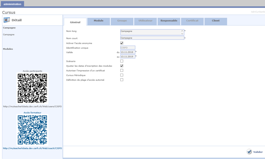 Cliquer sur le bouton Valider pour enregistrer les données saisies et avoir la possibilité d'inclure des modules à ce cursus et d'y inscrire des groupes et/ou des utilisateurs, etc.
