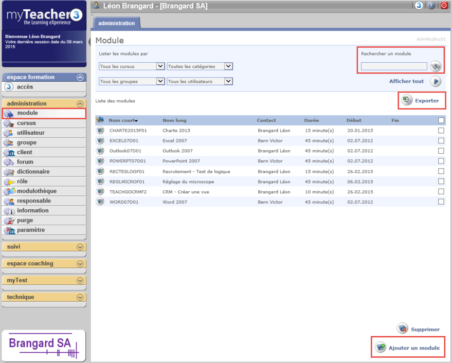 Remarque: pour modifier un module, utiliser les filtres ou la zone de recherche en haut de l'écran pour le localiser plus rapidement.