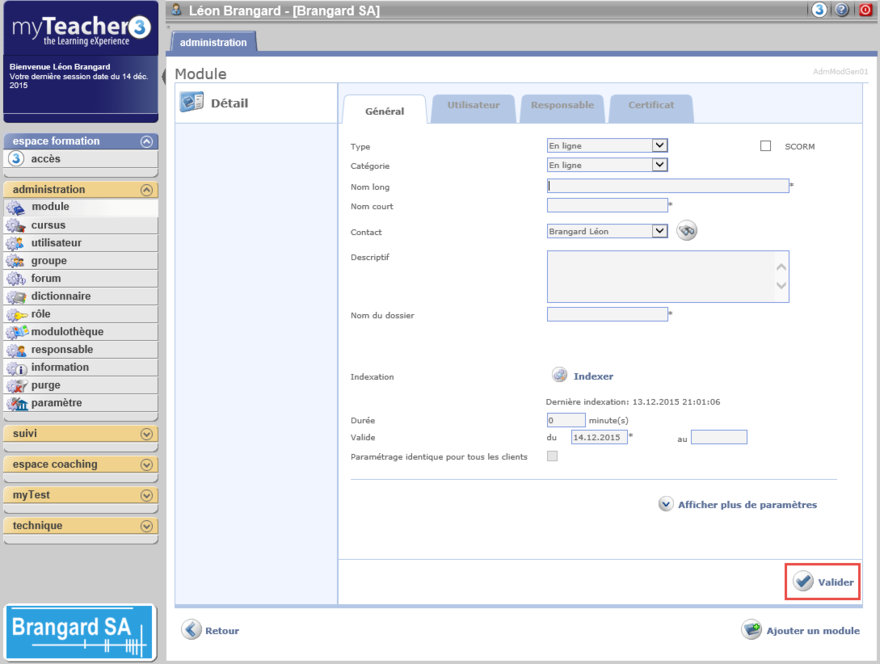Cliquer sur le bouton Valider pour enregistrer les données saisies et avoir la possibilité d'intégrer le fichier zip associé au module.