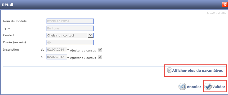 Il est possible de définir dès son ajout dans le cursus ou après coup, des paramètres à un module.