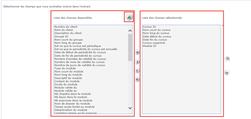 L’utilisateur choisit les champs à ajouter et/ou à supprimer et clique sur la flèche correspondante pour les basculer d’une liste à l’autre.