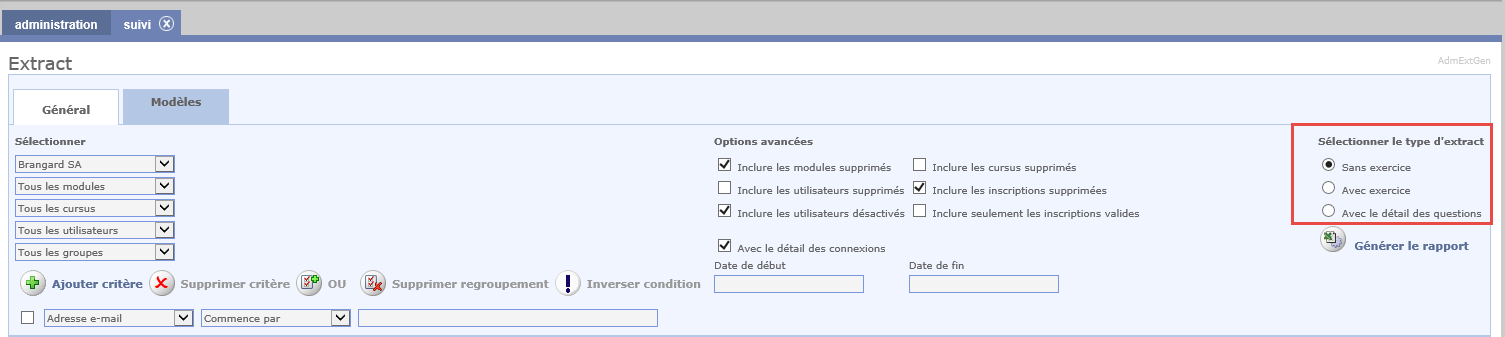 Pour voir apparaître cette option, sélectionner le type d'extract Sans exercice.
