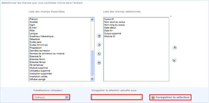 Donner un nom à cette sélection dans le champ Enregistrer la sélection actuelle sous. Cliquer sur le bouton Enregistrer la sélection avant de générer le rapport pour enregistrer la sélection des champs. La sélection enregistrée sera ensuite disponible dans le menu déroulant Présélections utilisateur.