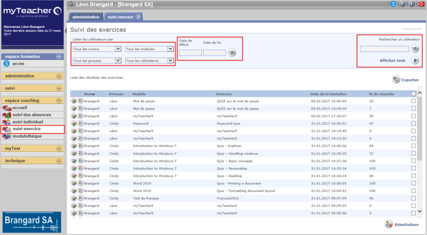 L’écran Suivi des exercices affiche la liste des tentatives des utilisateurs à des exercices.