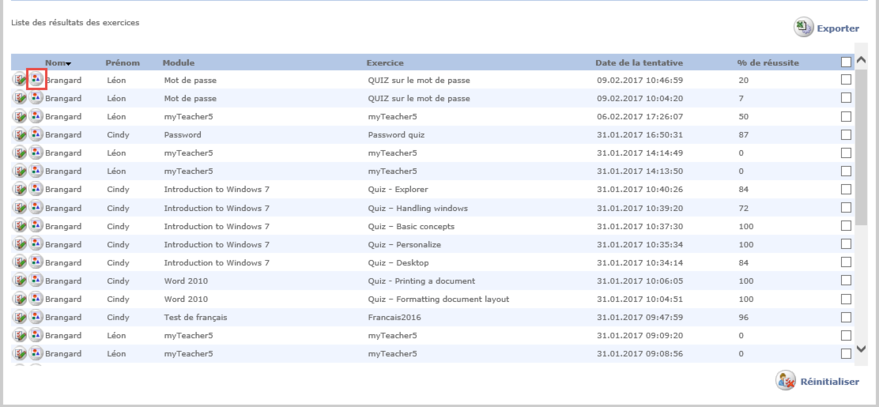 Le bouton Réinitialiser de l'écran Suivi des exercices permet de réinitialiser une ou plusieurs tentatives à des exercices. C'est-à-dire que cette tentative va être supprimée comme si elle n’avait jamais existée.