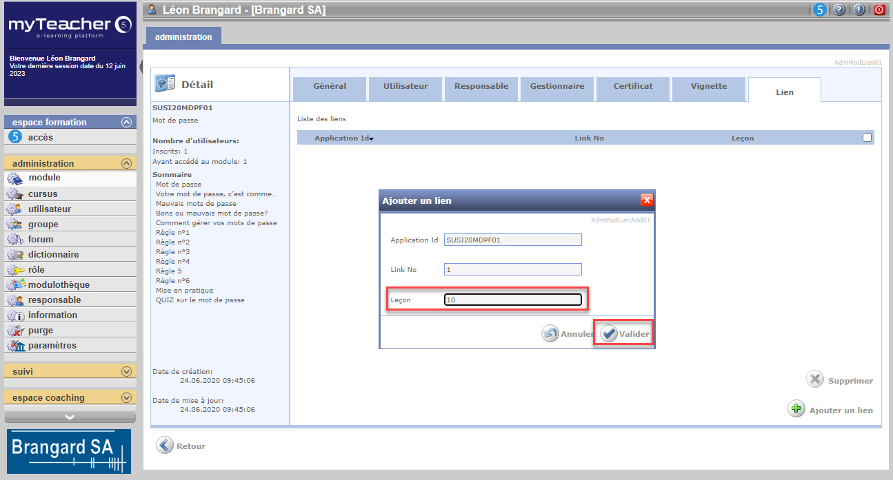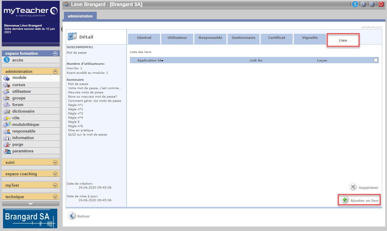 Dans le détail du module, cliquer sur l'onglet Lien, puis sur le bouton Ajouter un lien.