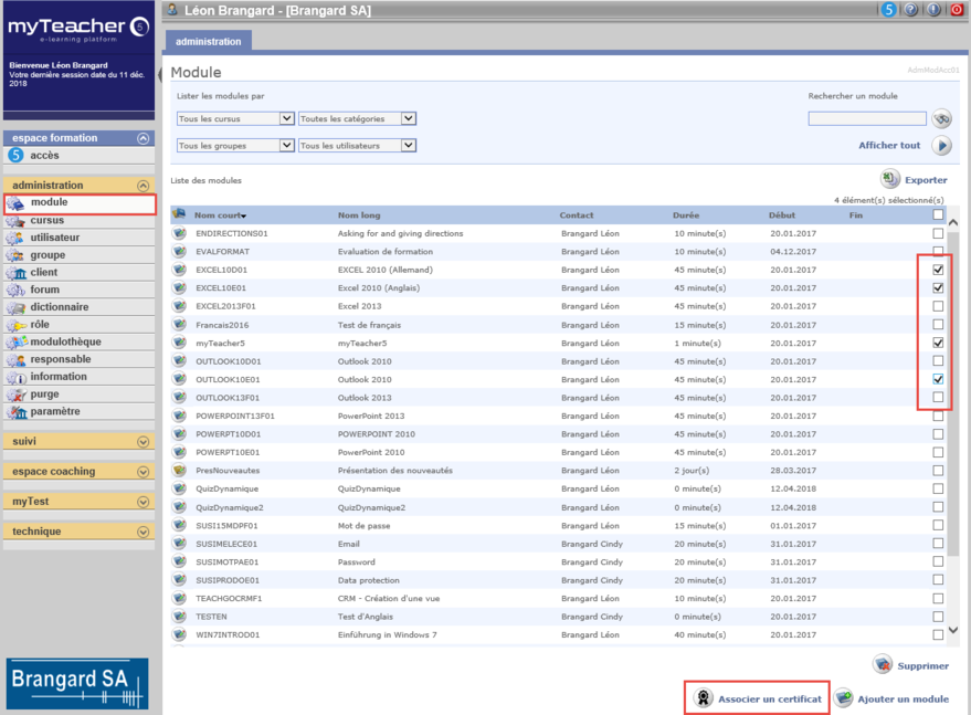 Dans la liste des modules, sélectionner les modules auxquels associer un modèle de certificat.