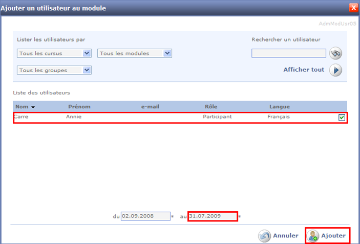 Sélectionner le module auquel vous souhaitez inscrire un utilisateur.