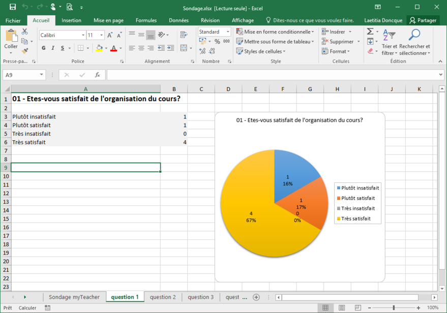 • un onglet par question avec les statistiques de réponses à la question et un graphique représentant ces réponses.