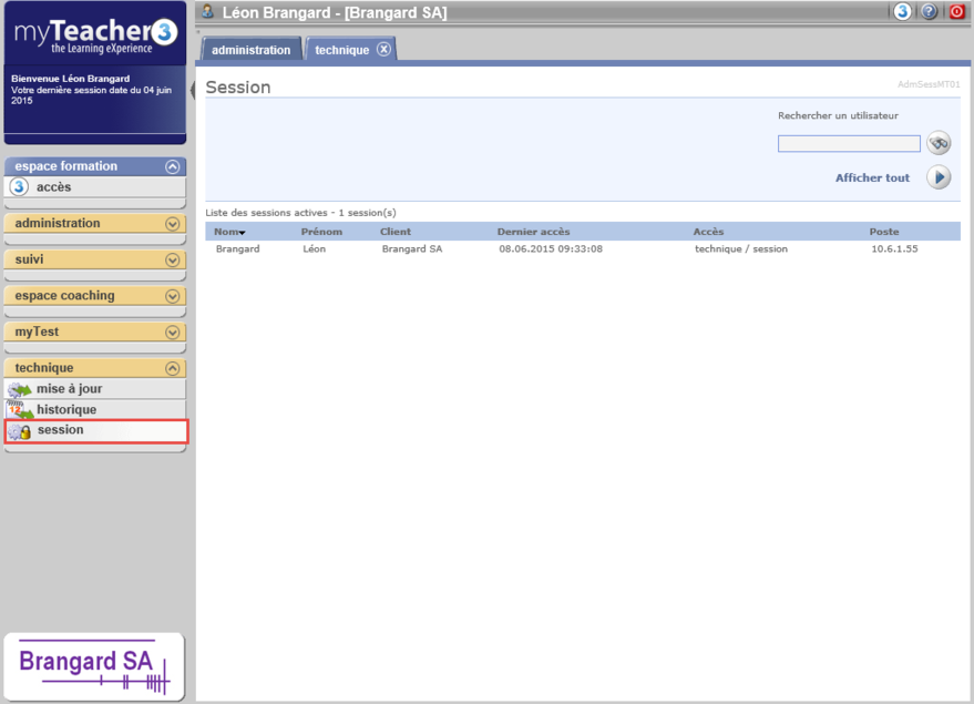 La rubrique session du bloc technique permet de visualiser la liste sessions actives (les utilisateurs connectés) de la plate-forme myTeacher.