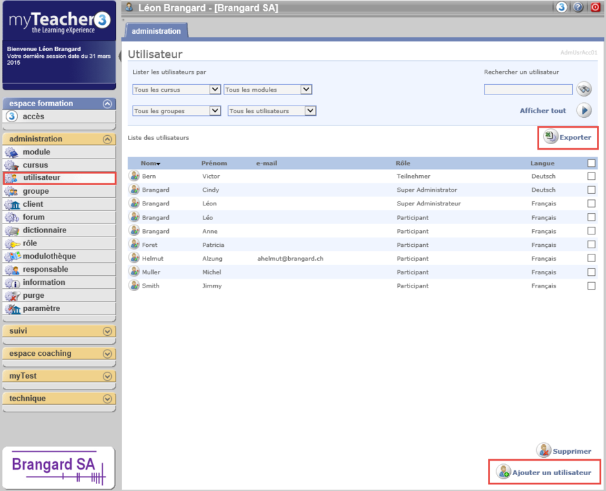 Avec le droit administrer les clients, il est possible de transférer un utilisateur d'un client à un autre à l'aide du champ Client. Si l'utilisateur est inscrit aux mêmes modules dans le nouveau client, il conserve alors l'intégralité de son suivi et de sa progression. Pour plus de détails, voir plus bas la rubrique Comment transférer un utilisateur d'un client à un autre?