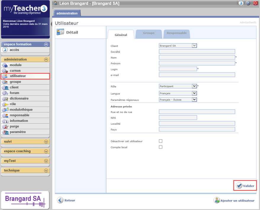Cliquer sur le bouton Valider pour enregistrer les données saisies et avoir la possibilité d'ajouter un groupe et/ou un responsable à l'utilisateur.