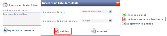 Pour insérer une liste déroulante, cliquer sur Insérer une liste déroulante, sélectionner d’abord le nom de la liste déroulante à afficher puis la bonne réponse.