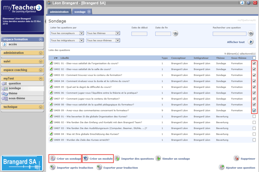 Sélectionner les questions à intégrer dans le sondage puis cliquer sur Créer un sondage pour créer le fichier zip nommé par défaut mysurvey.zip à intégrer dans un module myTeacher.