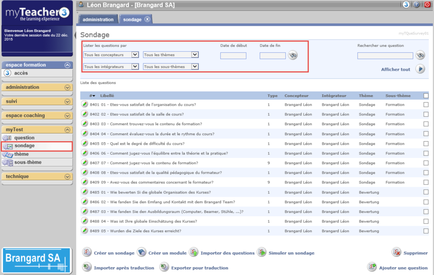 La rubrique sondage du bloc myTest permet de créer et de modifier des questions afin de générer un sondage pour faire évaluer un sujet par les utilisateurs.